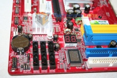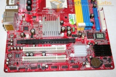 As we make our way around this motherboard, you can see that the I/O ports are plentiful for being such a small Micro-ATX motherboard. From the left you have the PS2 connections for your standard PS2 keyboard and mouse connectors, next you have the VGA connector and the DVI connector, both of which work with the on-board graphics processor. To the left of these you next have a stack set of two USB ports.Next to these you have a Gigabit LAN cable port and two more USB ports for a total of 4 USB ports on-board in the I/O area. Last but not least we find the two rows for the embedded Azalia 8-channel HD Audio which is fully compatible with Sound Blaster Pro standards.