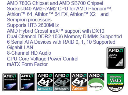 AMD 780G chipset based PCs feature the latest PCI-Express™ 2.0 bus technology and deliver high performance support for AMD’s new Hybrid CrossFireX™, allowing the combination of features or raw horse power from both the on board graphics and compatible add in PCI-E graphics boards, for the ultimate High-Def entertainment experience. Low latency architecture coupled with one of the industry’s most advanced core-logic solutions deliver qualified performance and the latest technologies — PCI-Express 2.0, secure high-speed networking, high-performance storage — and ensures that your PC stays ready for the latest games, future applications and next-generation PC specifications
