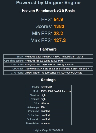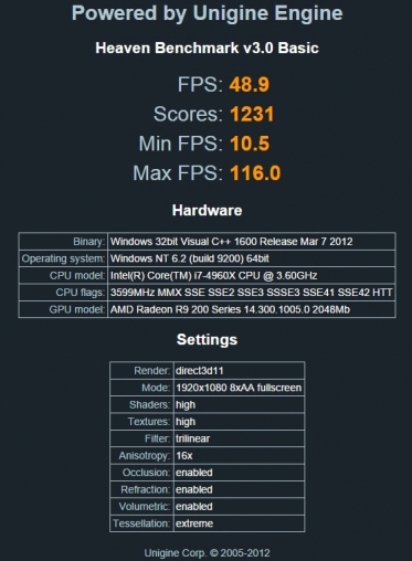 With all settings maxed out, our 285 averaged 48.9 fps, giving it a score of 1231 and edging out the 280 by a few fps.