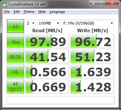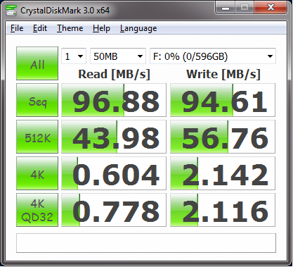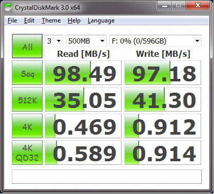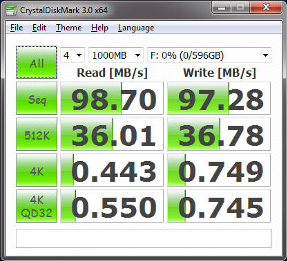 So now lets put this portable drive to the test. First the drive is connected to a USB 3.0 host controller featured on many of today’s newer motherboards (and available via add-in PCIe cards). Our test tool of choice is a software application called CrystalDiskMark. It is a synthetic disk benchmark utility that measures the sequential reads/writes speed and random 512KB, 4KB, 4KB (Queue Depth=32) reads/writes speed. The results of these tests provide a good indication of disk performance.