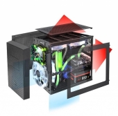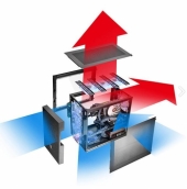 In terms of airflow and cooling there has been a great deal of thought put into the chambered design of the Core X1. The chambered design keeps hot and cool air separated with the upper chamber designed for maximizing airflow and efficiency and the bottom chamber dedicated to your storage and PSU. The large opening adjacent to the motherboard tray allows cool air to flow from the floor vents up to the motherboard chamber, pick up heat, and be carried away through the rear or top of the case.