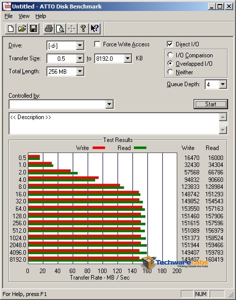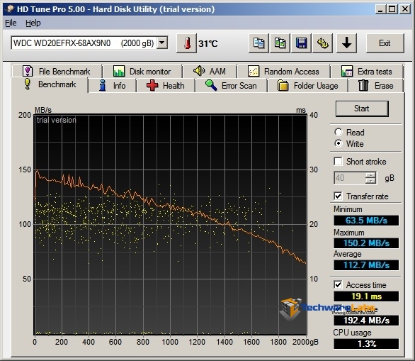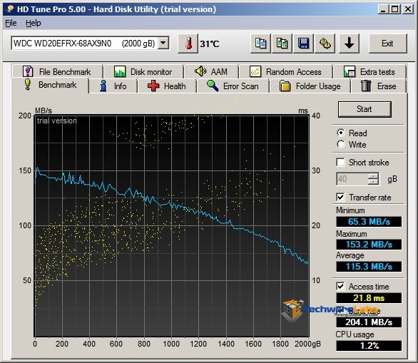 HDTune tests the entire length of a drive instead of just a small area. Because of how traditional platter hard drives work, their speed can vary depending on where on the platter you are. HDTun shows a nice graph of the speed of the drives. We can see that the results of this benchmark are right in line with what we’ve been seeing in the others.