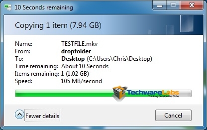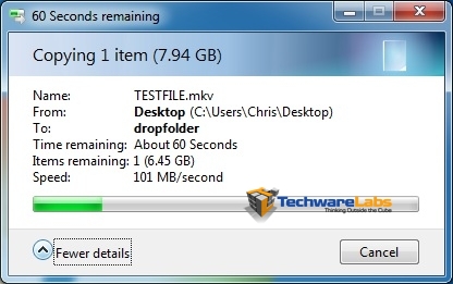 For our file transfer test we have the drives in a RAID 5 and configure a shared folder where we copy a large movie file to and from the share. We can see that the transfer rate is easily saturating the single gigabit connection to the file server. Unless you are using teamed NICs for your file server, you won’t be getting all the performance that these drives can deliver.