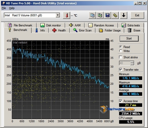 The RAID 5 read speeds are quite impressive at 429.9 MB/s. The write speeds are also quite respectable. Both read and write speeds are above 150 MB/s for the single drive, which is very good. With the IntelliPower variable RPM on the Red Drive, you wouldn’t expect it to perform at the same level as some 7200 RPM drives, but you would be wrong.