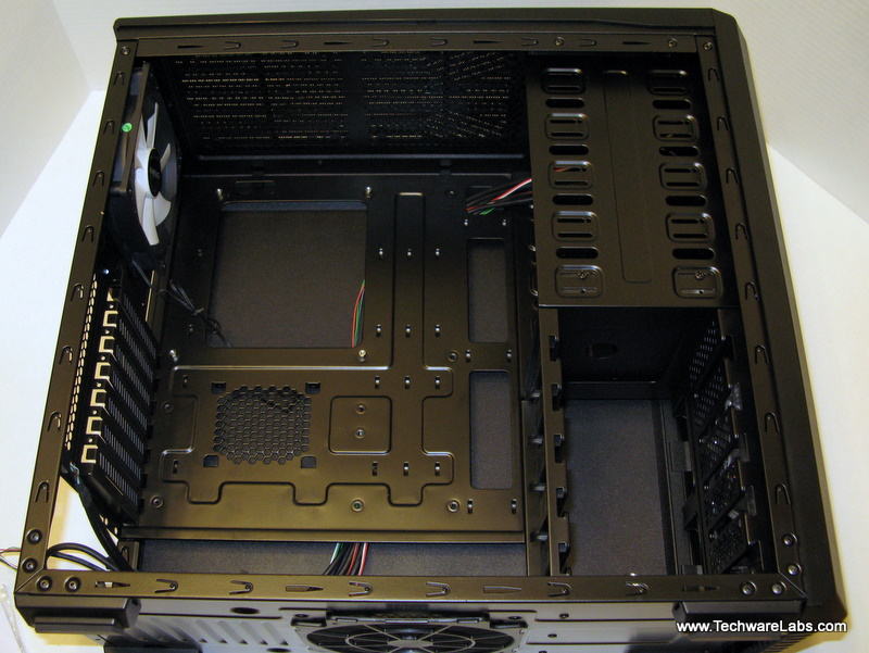 The overall look of the Z9 from a distance is a plain black computer tower. Once you move closer the attention to styling and design detail becomes clear. The inset top mesh, front I/O panel tucked into the first CD drive bay, and functional side mesh ‘stripe’ all make the tower sleek and stylish. The design is not only cool looking, a closer look and we find a total of 7 large 120mm cooling fan mounting locations, with available 140mm options in the front and bottom. Pre-punched water cooling hose hole with black grommets in the rear add to the available cooling options of the case. The interior of the case is also jet black from edge to edge matching the exterior finish.