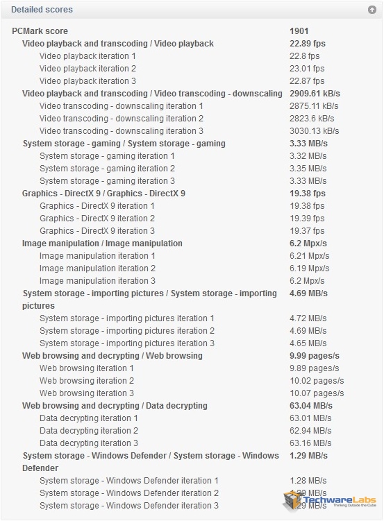 PCMark is an excellent tool capable of testing the entire system as a whole. It specifically focuses on video playback and transcoding, image manipulation, light graphics, system storage, and web browsing, all of which are common HTPC tasks. The A75-ITX paired with the A6-3650 does well considering the lack of a discreet graphics card.