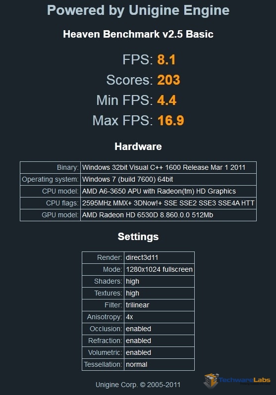 Unigine is an intensive DirectX 11 benchmark intended to test gaming systems. The low score is to be expected from this low-power combo, but the fact that it was able to even pass with an average of 8.1 fps is pretty impressive when you consider how difficult it is to run this benchmark. In an older game with DirectX 11 disabled and settings lowered, this system would be able to hold its own.