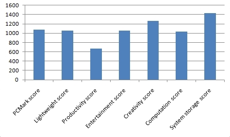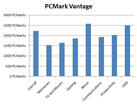 PCMark Vantage scores were about what you’d expect, with an overall score of 2226. Unsurprisingly, music and storage performance came out the best, while more demanding tasks like video transcoding scored lower.